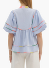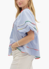 Solid short puff sleeve v-neck top featuring contrasting multi-colored trim detail. Self-tie detail at neckline.