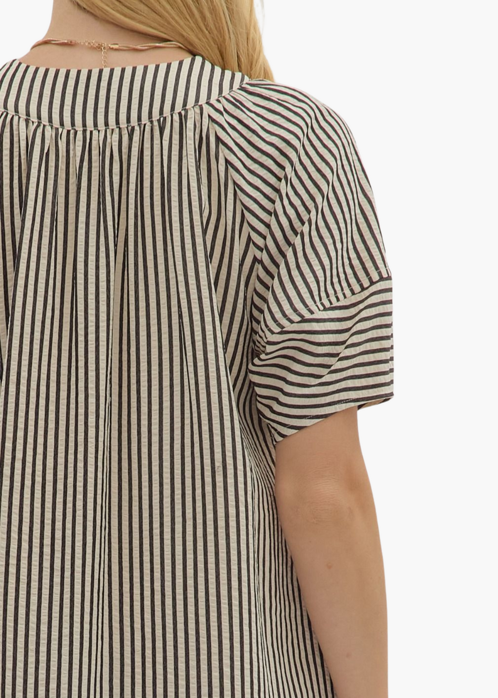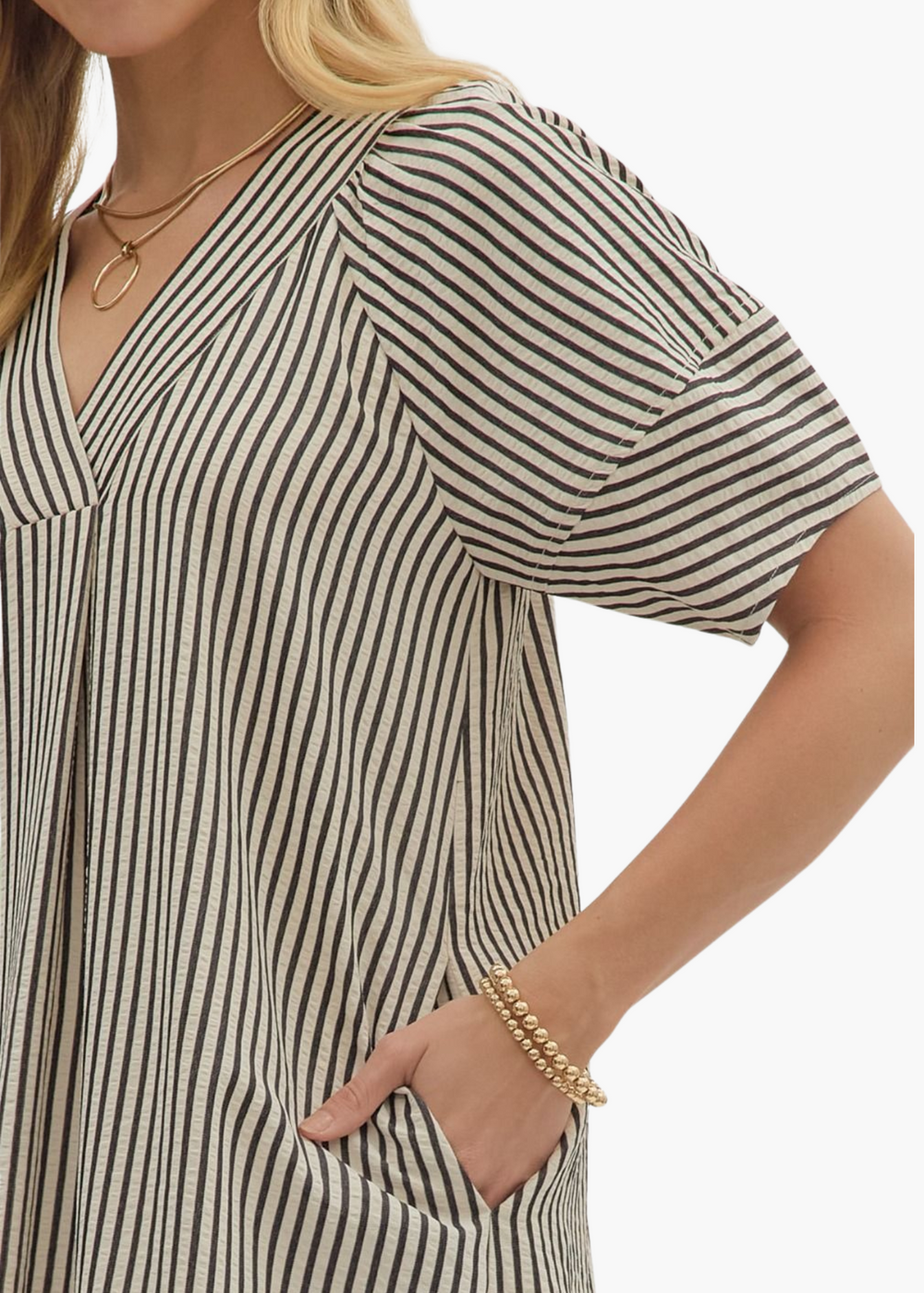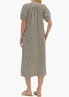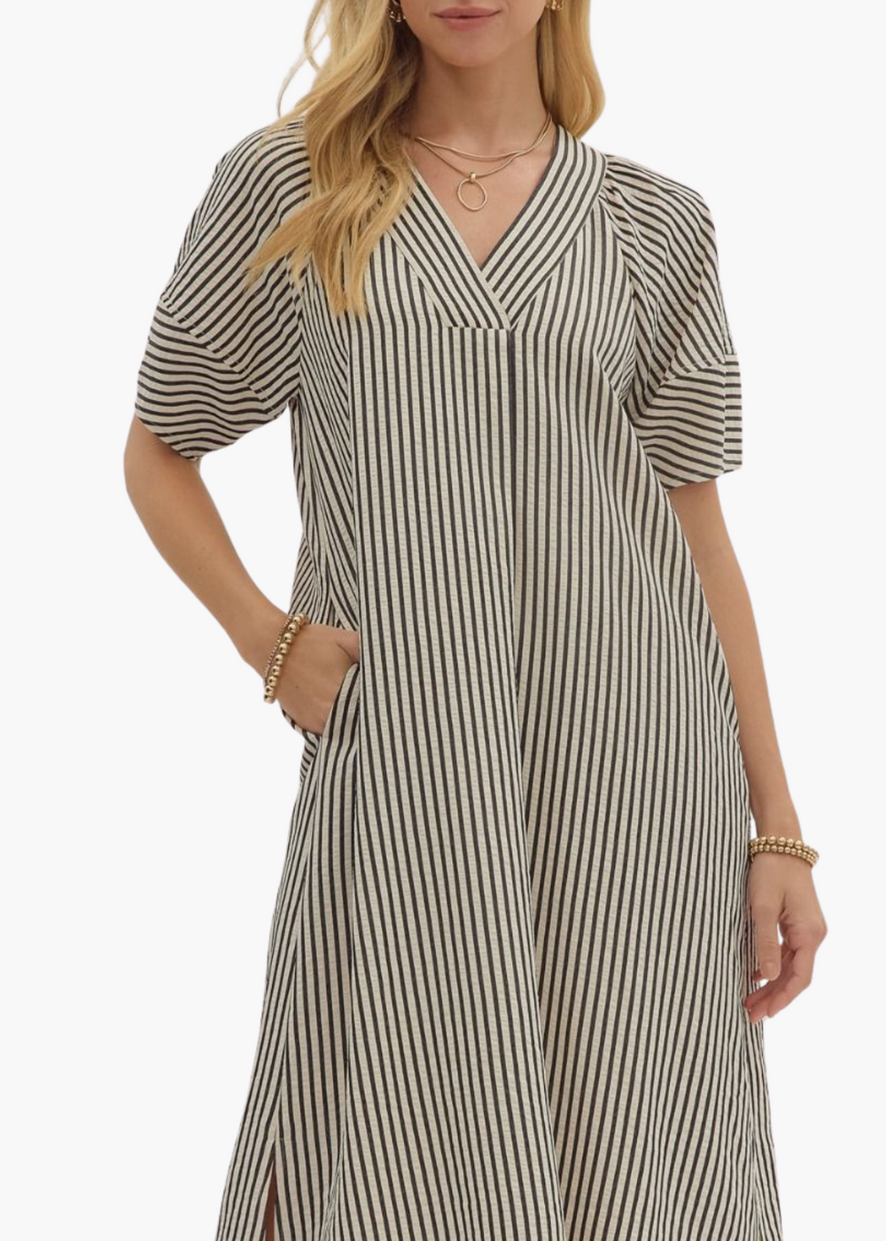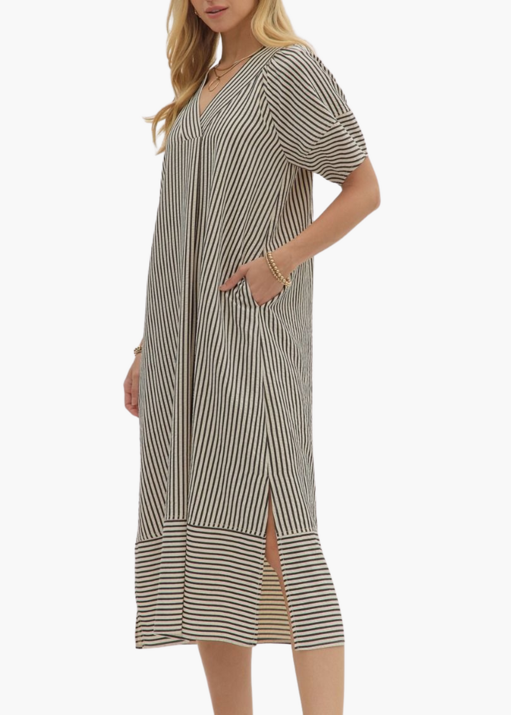 Stripe pattern textured pullover midi dress features raglan lantern sleeves and slit side hems. Pockets at side. Lined. Woven. Non-sheer. Lightweight.