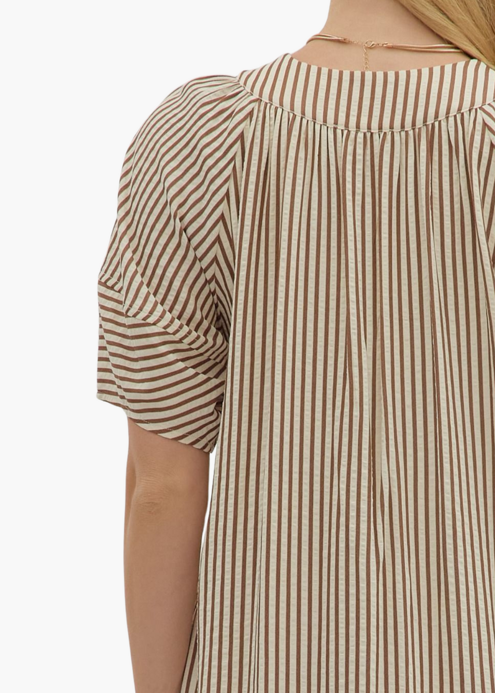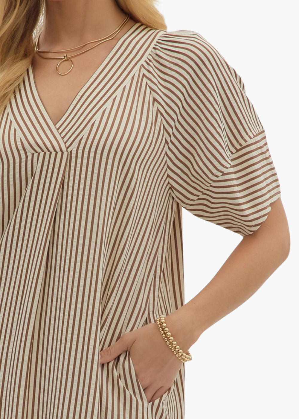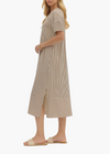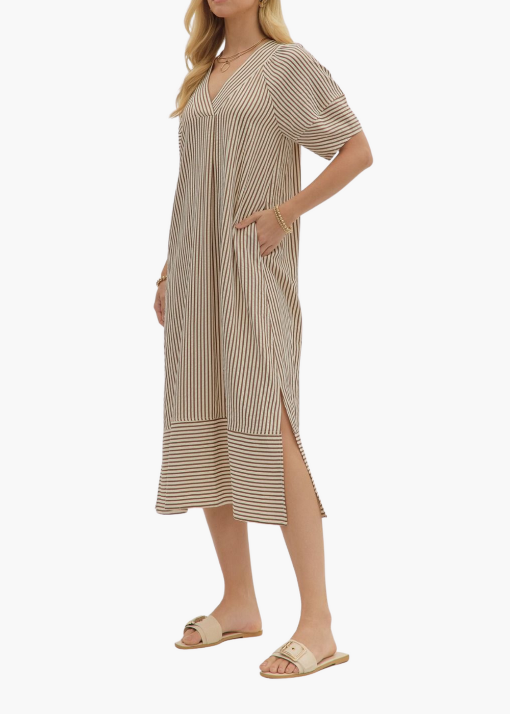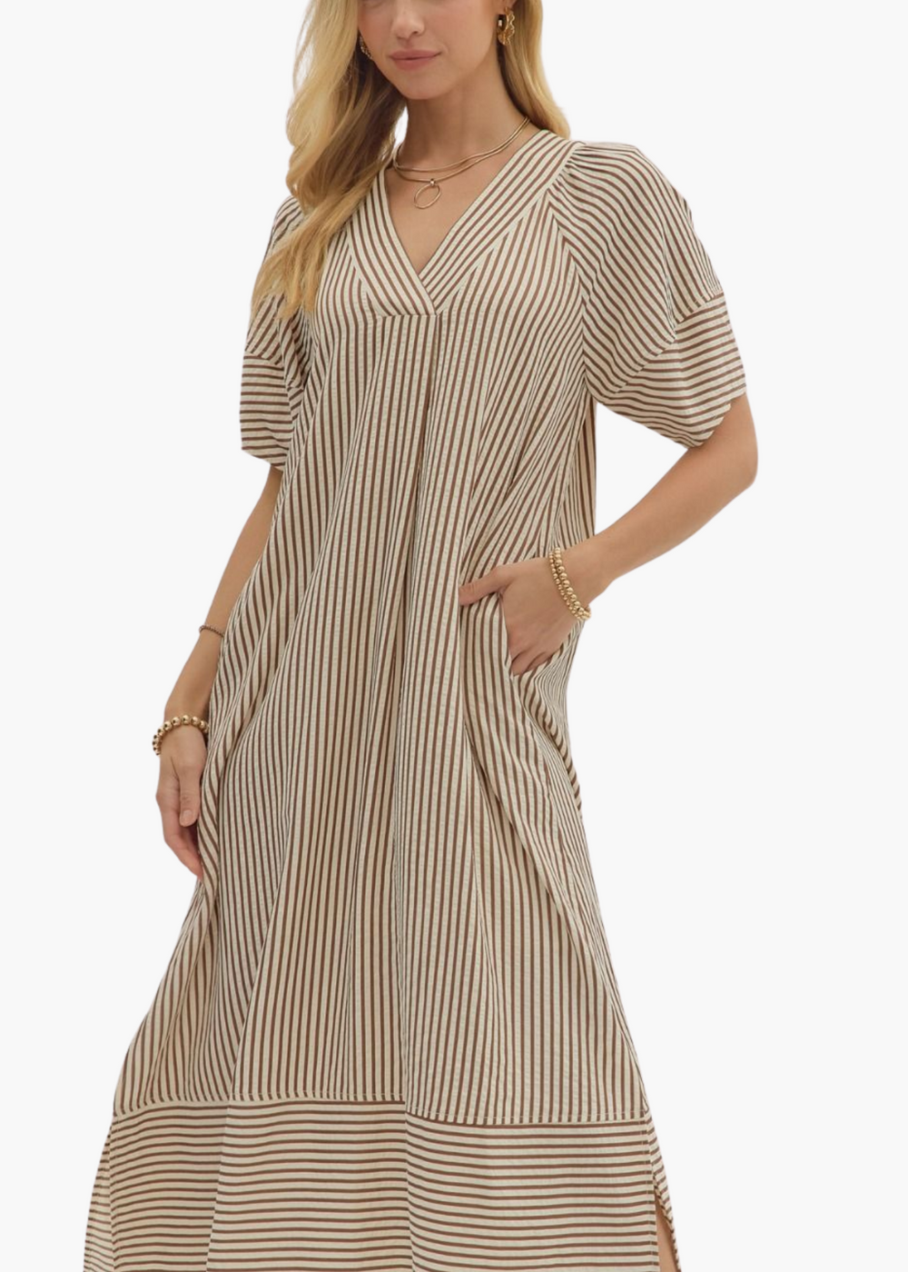 Stripe pattern textured pullover midi dress features raglan lantern sleeves and slit side hems. Pockets at side. Lined. Woven. Non-sheer. Lightweight.
