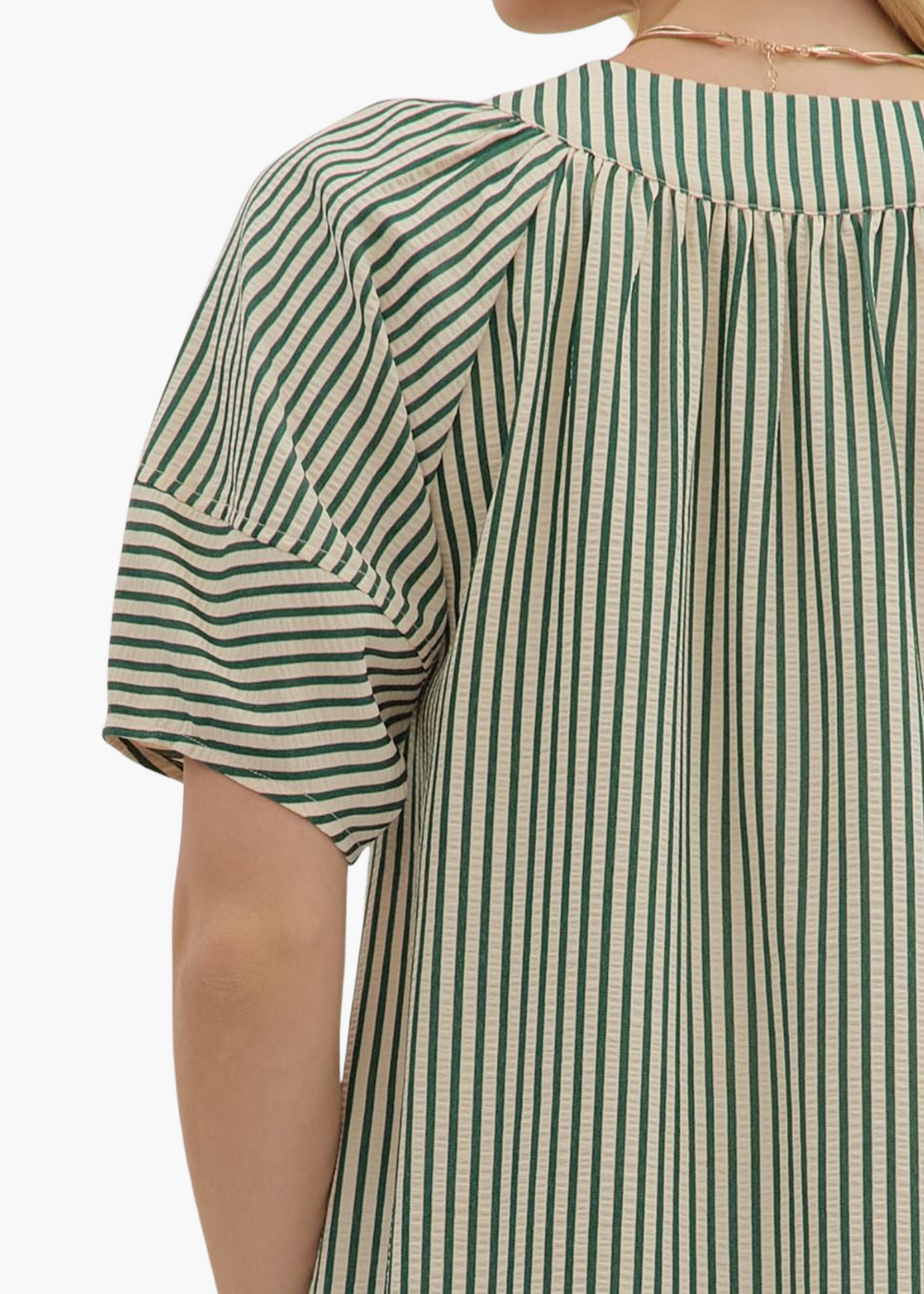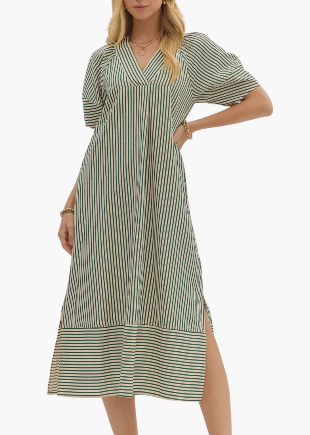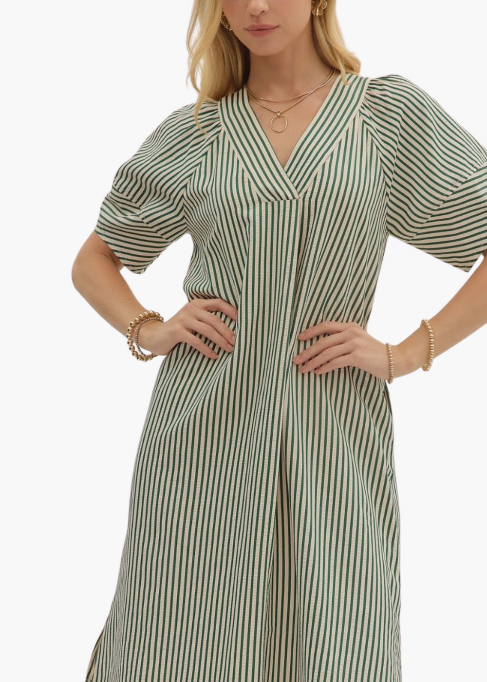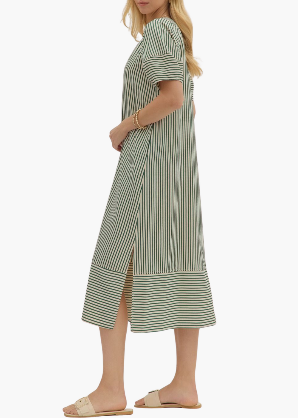 Stripe pattern textured pullover midi dress features raglan lantern sleeves and slit side hems. Pockets at side. Lined. Woven. Non-sheer. Lightweight.