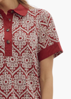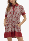 Embroidered contrast band and hem short sleeve swing dress featuring contrast accent collar button closure front. Side pockets. Lined. Woven. Non-sheer. Lightweight.