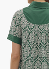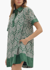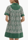 Embroidered contrast band and hem short sleeve swing dress featuring contrast accent collar button closure front. Side pockets. Lined. Woven. Non-sheer. Lightweight.
