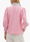 Solid ¾ balloon sleeve popover top featuring contrast ruffle neck. Half button front closure. Unlined. Knit. Non-sheer. Lightweight.