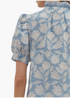 Botanical embroidery short puff sleeve top featuring scallop edge ruffled neck band collar. Button closure at front. Sleeve cuff button detail. Unlined. Woven. Non-sheer. Lightweight.