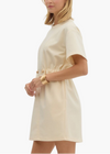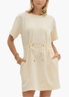 Solid round neck short sleeve mini dress featuring adjustable drawstring at waist. Pocket at sides.
