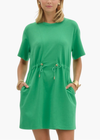 Solid round neck short sleeve mini dress featuring adjustable drawstring at waist. Pocket at sides.