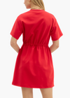 Solid round neck short sleeve mini dress featuring adjustable drawstring at waist. Pocket at sides.