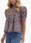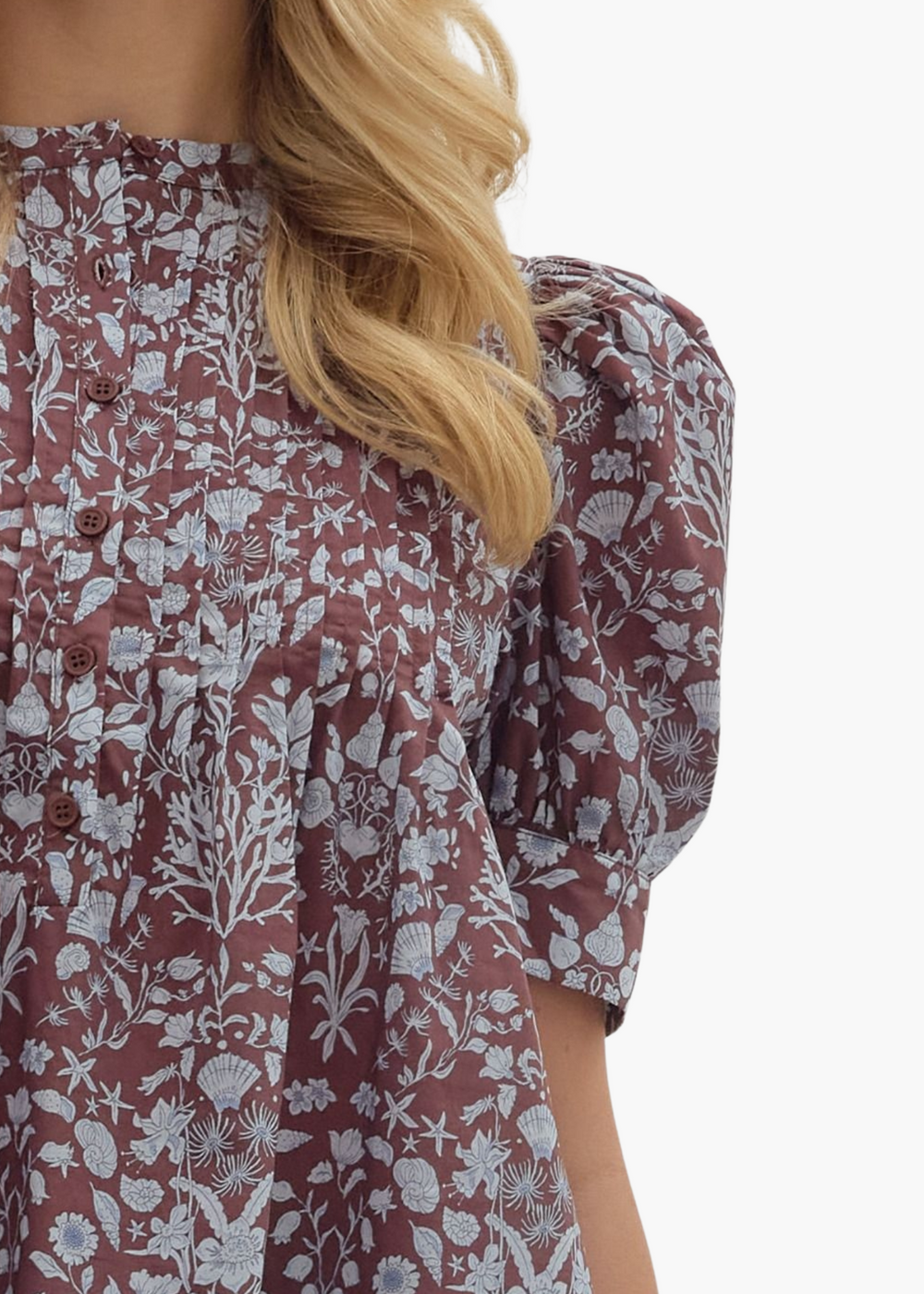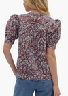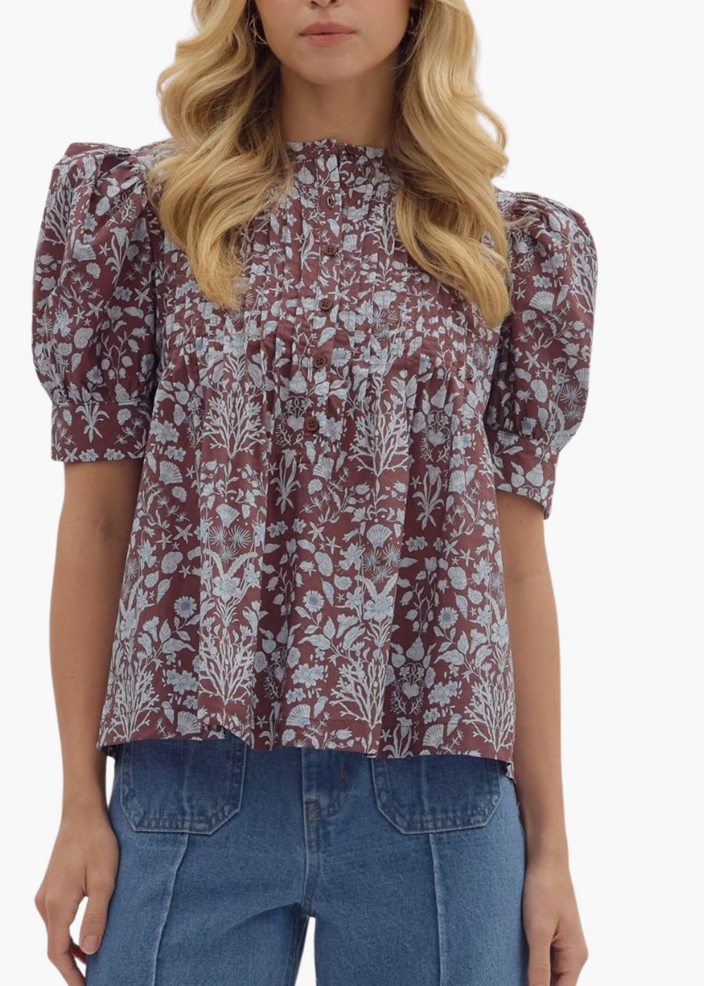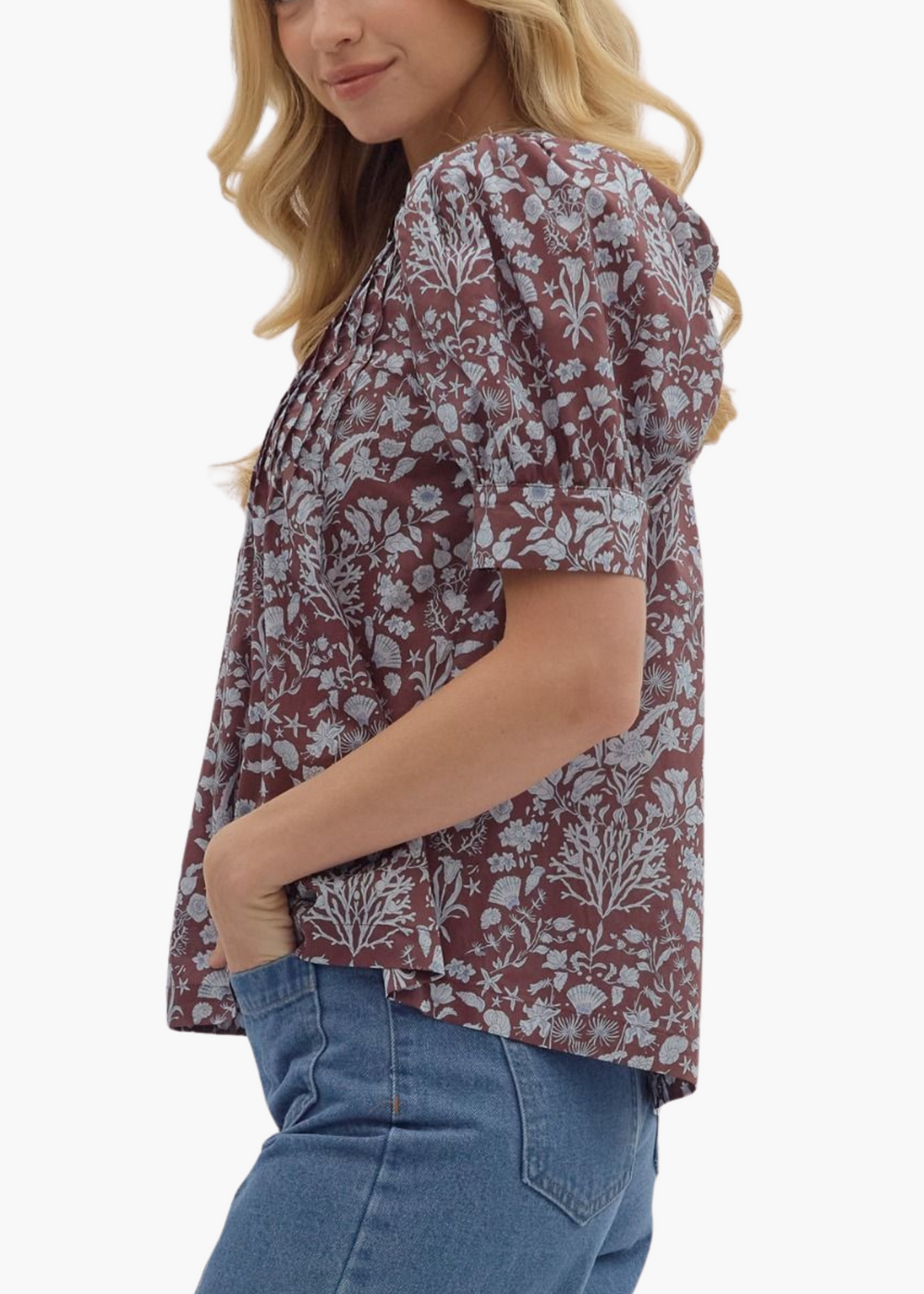 Floral print cuff band puff shoulder sleeve pintuck top. Button front closure. Unlined. Woven. Non-sheer. Lightweight.