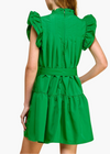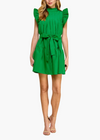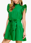 Ruffle mock neck, pleated dress. With short ruffle sleeve and detachable waist tie. Featuring a ruffle hem and a concealed back zipper.