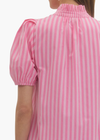 Stripe print puff sleeve midi dress featuring ruffled accent neck band collar. Button closure at front. Elasticated sleeve openings. Side pockets. Lined. Woven. Non-sheer. Lightweight.