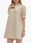 Solid short puff sleeve mini dress featuring ruffle band collar button closure at front. Side pockets. Lined. Woven. Non-sheer. Lightweight.