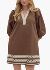 Solid 3/4 sleeve mini dress featuring contrast collar and V-neck with scallop accent trim. Side pockets. Lined. Woven. Non-sheer. Lightweight.