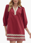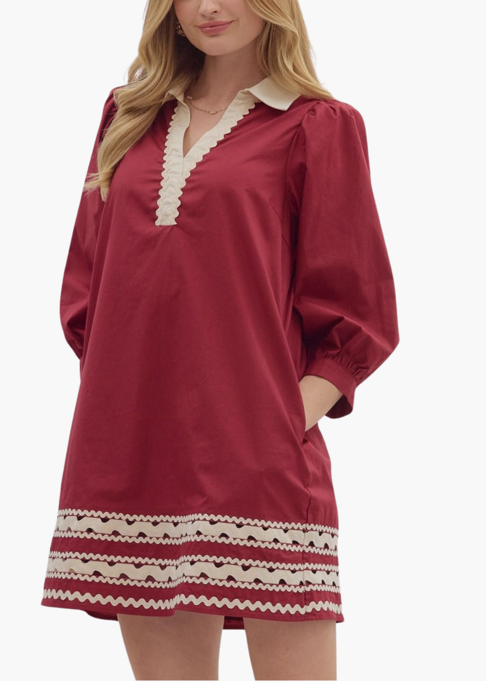 Solid 3/4 sleeve mini dress featuring contrast collar and V-neck with scallop accent trim. Side pockets. Lined. Woven. Non-sheer. Lightweight.