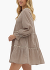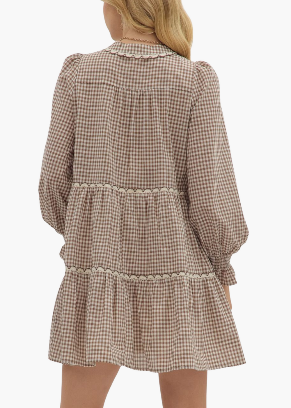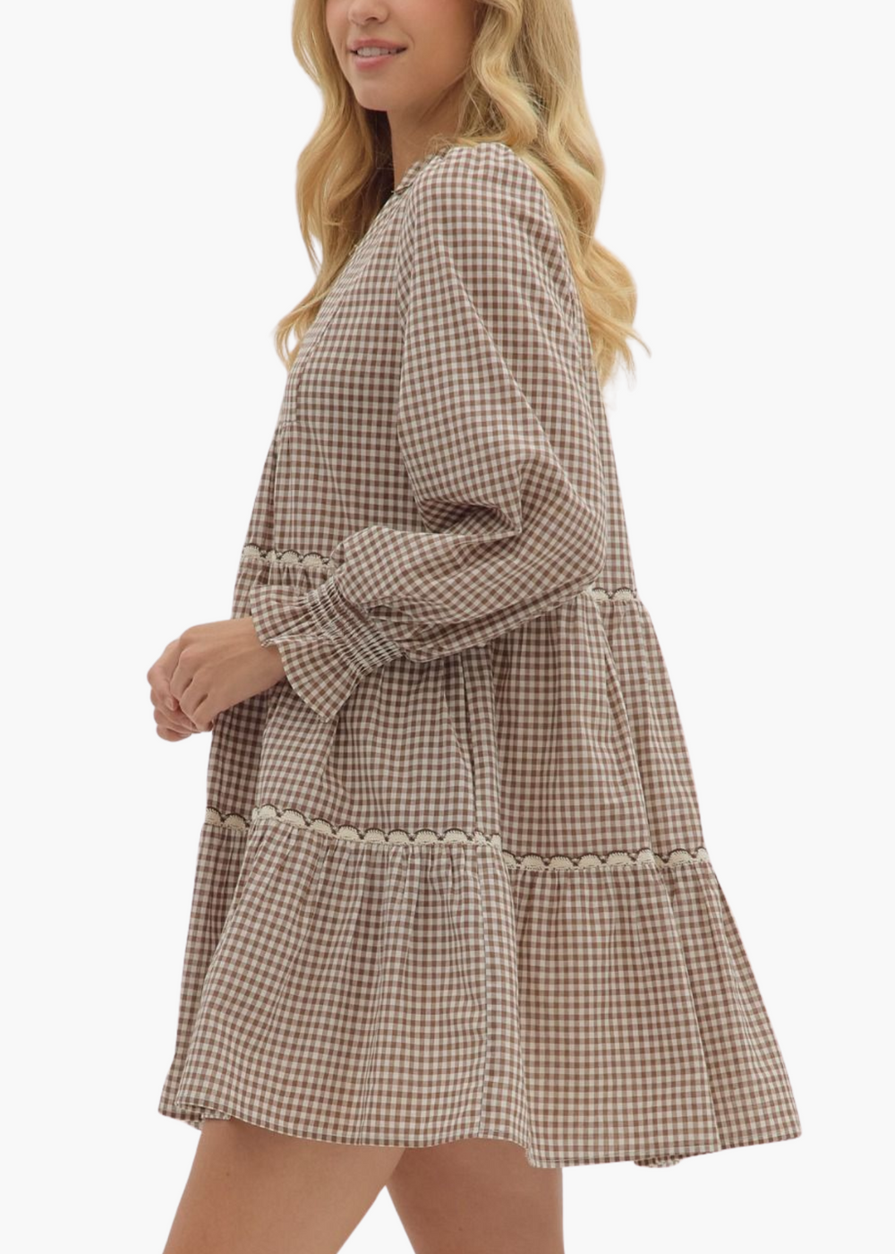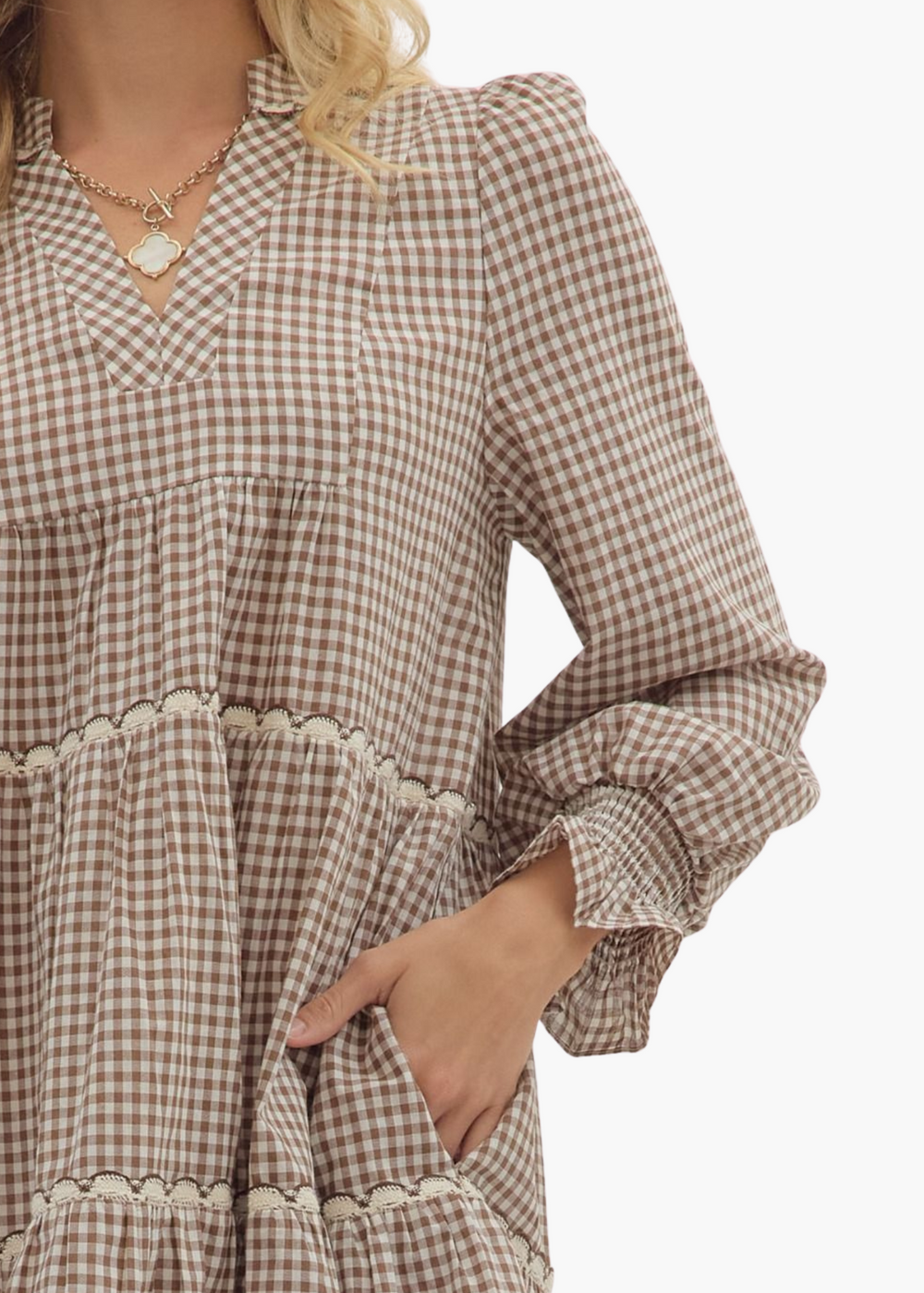 Gingham long sleeve mini dress featuring V-neck with subtle ruffle trim. Scallop lace accent at tier seams. Smocked cuffs. Side pockets. Lined. Woven. Non-sheer. Lightweight.