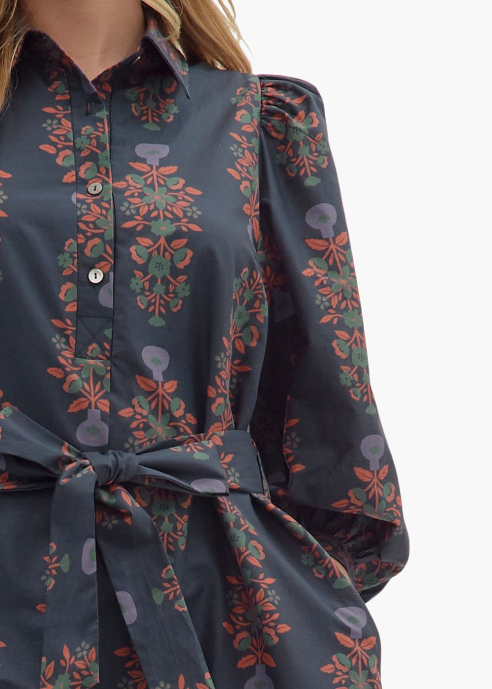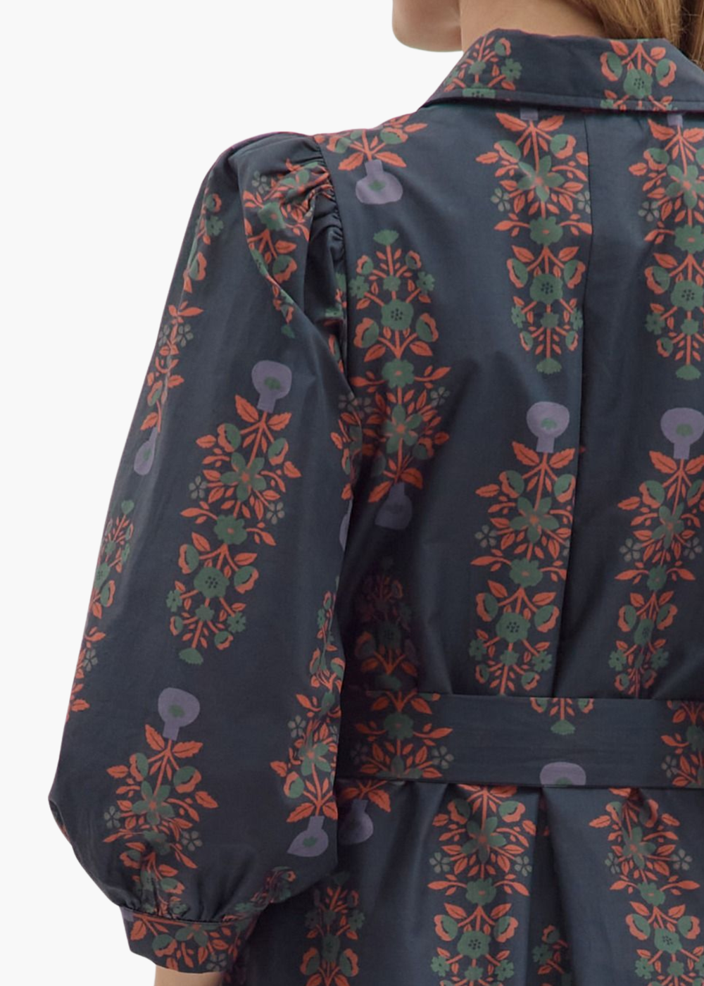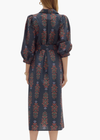 Botanical print puff 3/4 sleeve midi dress featuring button closure at front and detachable waist tie. Side pockets. Lined. Woven. Non-sheer. Lightweight.