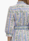 Floral stripe print 3/4 puff sleeve midi dress featuring ruffled mock neck and self-tie sash at waist. Button closure at front. Side pockets. Lined. Woven. Non-sheer. Lightweight.