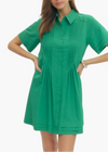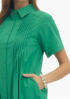 Solid short sleeve mini shirt dress featuring pintuck detail at front and back, button closure at front, and side pockets. Lined. Woven. Non-sheer. Lightweight.