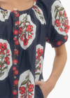 Floral print short puff sleeve mini dress featuring contrast embroidered trim along neckline, sleeve cuffs, front placket, and hem. Button closure at front. Side pockets. Lined. Woven. Non-sheer. Lightweight.