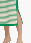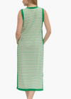 Striped sleeveless midi dress featuring contrast side panel and side slit. Unlined. Knit. Non-sheer. Lightweight.