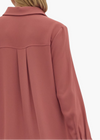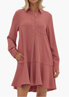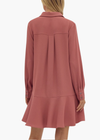 Solid collared long sleeve mini dress featuring pockets at bust and side. Button up detail at bust. Ruffled hem. Unlined. Woven. Non-sheer. Lightweight.