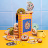 Snack on this! Box of Bagels is a collection of 12 round mini puzzles. Each bite-sized mini is 5 inches across and includes 45 jigsaw pieces. One box with 12 mini puzzles inside.
