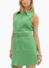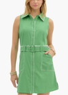 Solid sleeveless collar button front dress featuring blanket stitch edge finish. Cargo pockets at front. Removable belt. Lined.