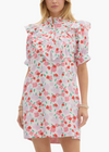 Floral print cuff band short sleeve mini dress features ruffle accented V-yoke and band collar button closure. Pockets at side.