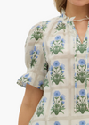 Floral pattern ruffle finish pullover top featuring outer smocked short sleeve. Unlined. Woven. Non-sheer. Lightweight.