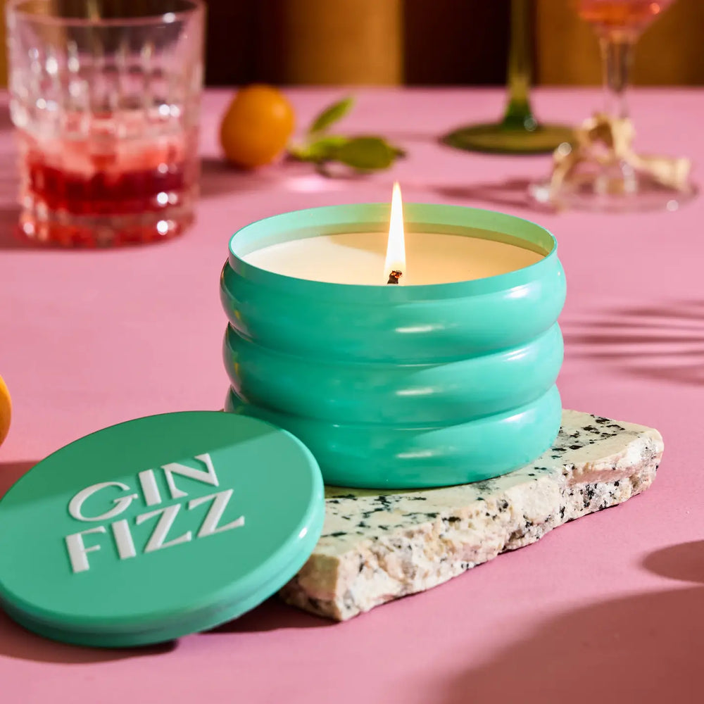 Fresh, frothy, and delicately complex. Embrace the spirit of a classic with a modern twist in our Gin Fizz candle. Enclosed in a vivid, turquoise colored tin, this fragrance bursts with the freshness of cool cucumber, the subtle sweet floral notes of elderflower, and the distinct, crisp gin botanicals.