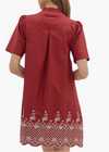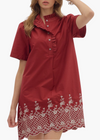 Scallop finish embroidered hem puff shoulder short sleeve mini dress. Ruffle band collar button closure.