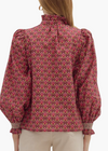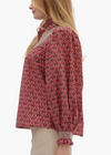 Floral print long sleeve button-up top featuring smocked yoke and ruffled stand collar. Smocked cuffs. Unlined. Woven. Non-sheer. Lightweight.