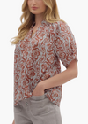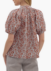Floral print pleated raglan short puff sleeve top featuring ruffled accent neck band collar V-neck. Unlined. Woven. Non-sheer. Lightweight.