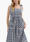 Gingham pattern straight neck shoulder scallop edged tie pullover midi dress featuring ricrac trim at hem. Elasticated smocking at back panel. Lined. Woven. Non-sheer. Lightweight.