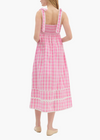 Gingham pattern straight neck shoulder scallop edged tie pullover midi dress featuring ric rac trim at hem. Elasticated smocking at back panel. Lined. Woven. Non-sheer. Lightweight.