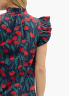Floral print ruffle flutter sleeve midi dress featuring ruffle finish neck band collar button front closure. Pockets at sides. Lined.