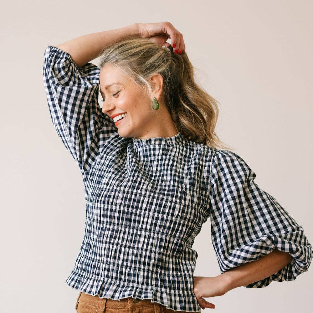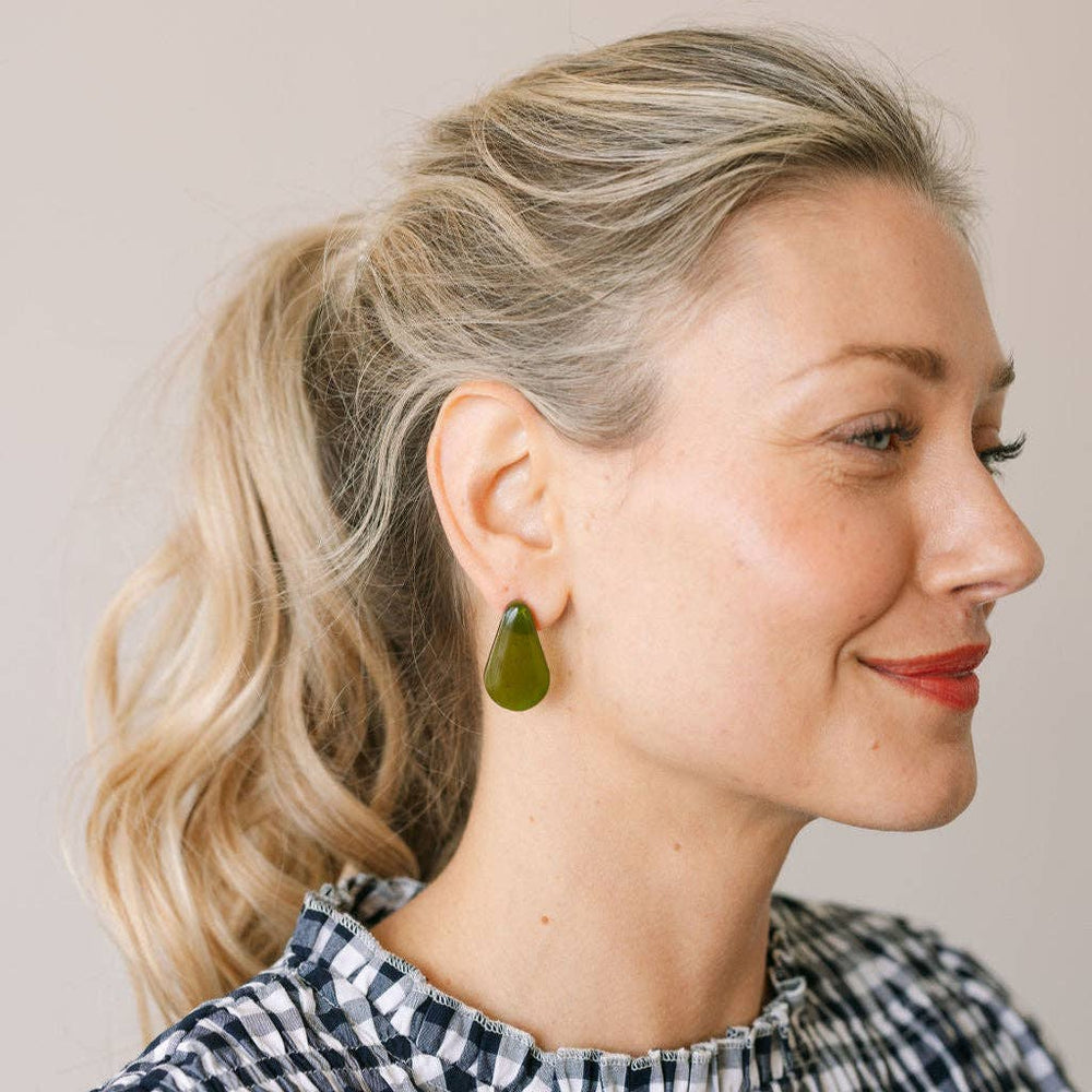 The Kiwi Dew Drop Earrings feature a refreshing blend of translucent green and modern curves, bringing a zesty touch of fun to any outfit.