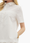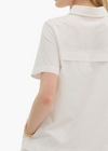 Solid short sleeve pullover twofer mini dress featuring double shirt pockets and at sides. Collar button closure. Lined. Woven. Non-sheer. Lightweight.