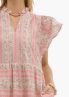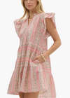 Paisley print double ruffle flutter sleeve pullover tiered mini dress. Adjustable self tie ruffled round split neck. Pockets at side. Lined.