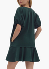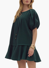 Solid textured short sleeve drop waist mini dress featuring self-tie detail at neckline.