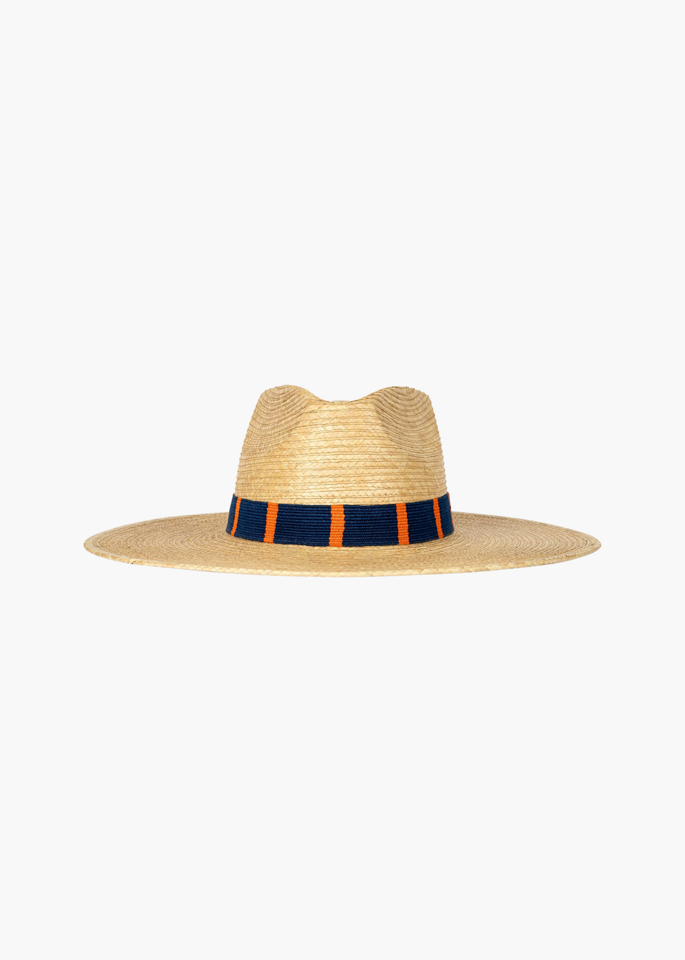 Our Navy and Orange Palm Hat is tailgate-ready and stadium-approved—perfect for shielding the sun while you cheer on your team in style. With bold, team-inspired colors and a silhouette that turns heads, they bring the perfect mix of cute and spirited to any Saturday kickoff. Each hat is a part of our sustainable, fair trade hat collection and rated UPF 50+, the highest possible UV protection. Due to the complexity of a hat made by hand, each hat slightly varies within a size. Help us hand select the right hat for you and include your head size in the order notes upon checkout. Details: Permanent woven band attached to crown of hat Navy and orange stripes Hat Brim measures 3 3/4" wide Crown of hat measures 4 1/2" tall UPF 50+
