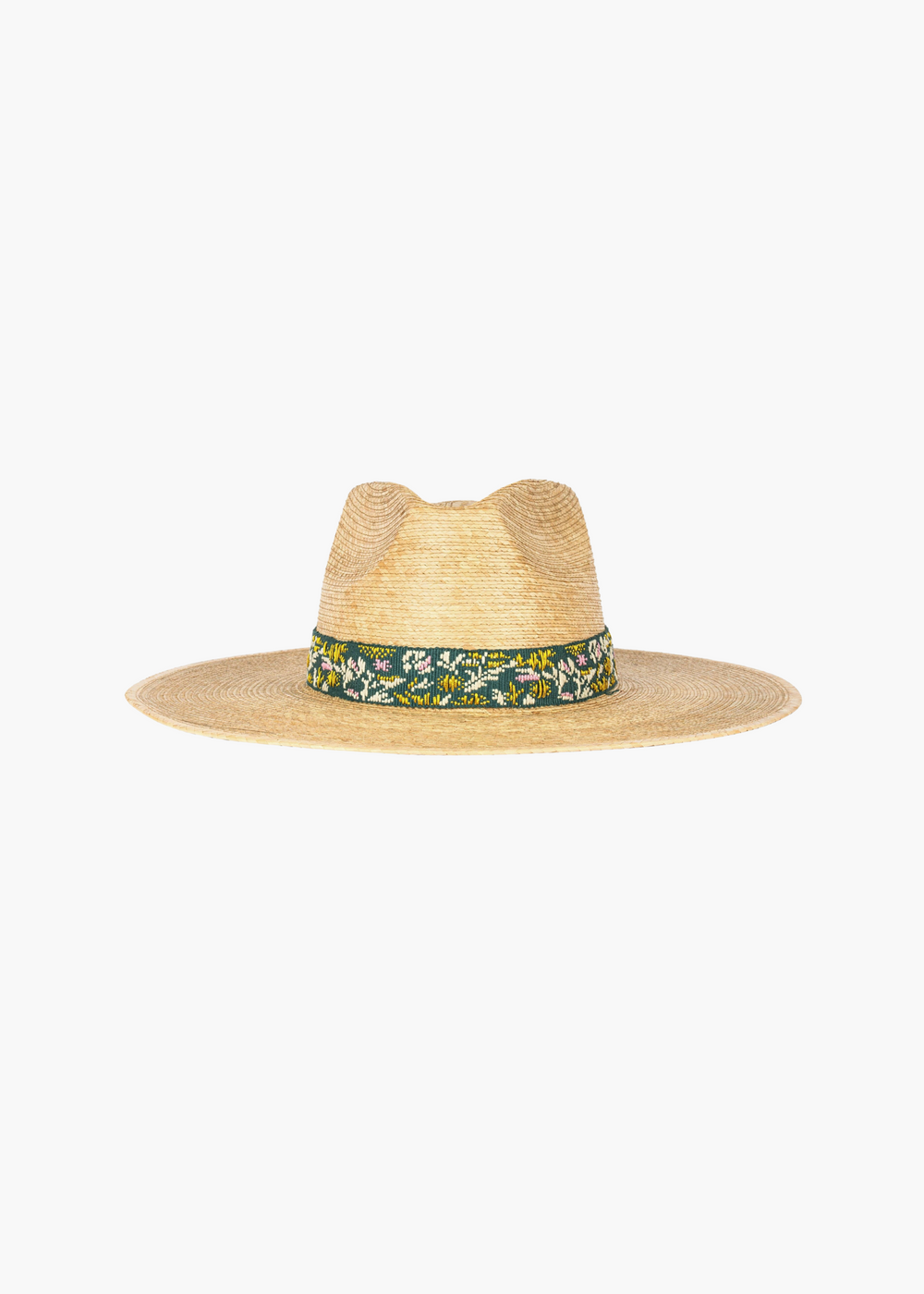 The Paradise Floral Palm Hat features a dark teal cotton band with a pink, ivory, and gold embroidered florals and is a part of our sustainable, fair trade hat collection and graded at the highest UPF rating.