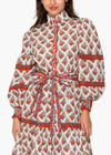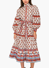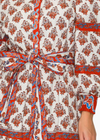 The fully open shirt-front design adds versatility, while the belted waist and side pockets bring both ease and structure. Delicately accented with earthy terracotta and sky-blue tones, this piece evokes a sense of wanderlust and timeless femininity.