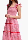 This smocked maxi dress features playful flutter sleeves and a tiered skirt adorned with contrasting trim details. Its fitted bodice and flowing silhouette create a flattering and feminine look, perfect for sunny days or casual gatherings.