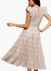 Striped capped sleeves midi dress. It displays two ruffled layered capped sleeves, a crew neckline, and a smocked upper body. It also features a keyhole on the upper back, and a midi ruffled skirt.
