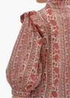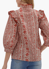 Floral stripe print ¾ sleeve top featuring ruffled mock neck with lace-trimmed shoulder flounce and front placket. Button closure at front. Unlined. Woven. Non-sheer. Lightweight.