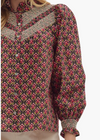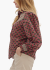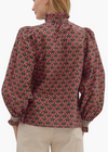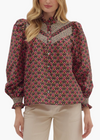 Floral print long sleeve button-up top featuring smocked yoke and ruffled stand collar. Smocked cuffs. Unlined. Woven. Non-sheer. Lightweight.