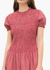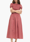 The Gisele Dress is a lightweight gingham midi with a smocked, fitted bodice and a full skirt for a flattering silhouette. Featuring short puff sleeves, a ruffle-trimmed crewneck, and a back keyhole with partial button closure, it offers charming, subtle detailing.