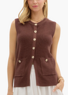 Solid sweater knit sleeveless sweater vest featuring gold accented button closure at front. Patch pockets at front. Unlined. Knit. Non-sheer. Lightweight.