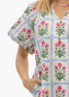 Floral pattern short bubble sleeve pullover mini dress. Ruffle finish V-neck button closure at front. Pockets at sides. Lined.