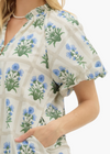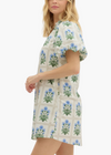 Floral pattern short bubble sleeve pullover mini dress. Ruffle finish V-neck button closure at front. Pockets at sides. Lined. Woven. Non-sheer. Lightweight.